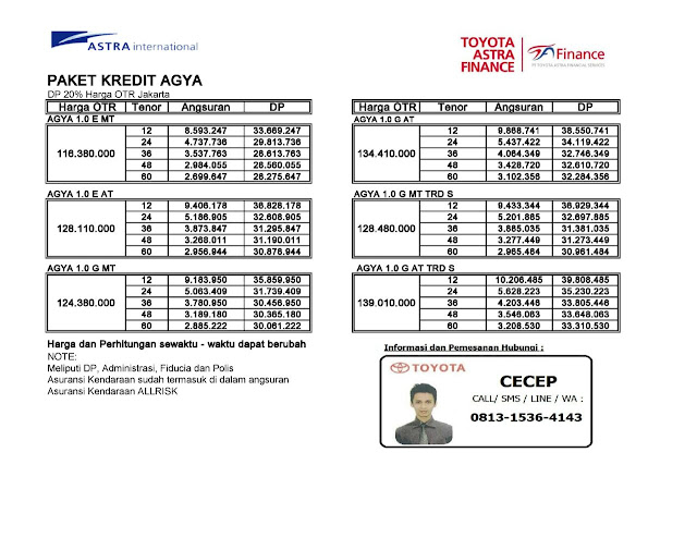 Berikut Tabel Angsuran dan DP Paket Kredit Toyota Agya Dealer Resmi Toyota Auto 2000 Lippo Cikarang Per Februari 2017.